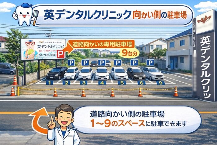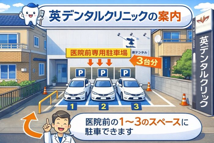 英デンタルクリニックは、治療の質だけでなく、こうした通いやすい環境づくりにもこだわっています。広々とした駐車場は、患者さまの日常に寄り添い、安心して通院していただくための大切なポイントのひとつです。