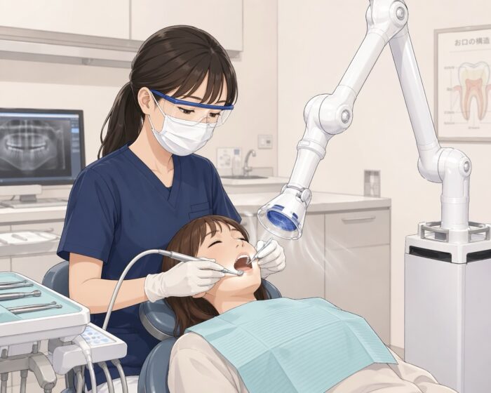 治療や歯のメンテナンス時には空気中に唾液や削った時に出る血液・金属片・粉塵 など「エアロゾル」と呼ばれる微小な液体や固体の粒子が飛んでしまいます。